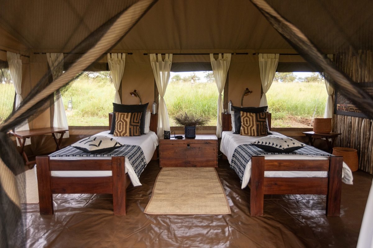 Sero Tented Camp is a mobile safari camp that moves with the wildebeest migration—sometimes near Ndutu for calving season, other times in Kogatende for river crossings—so you’re always close to the action. The camp features spacious, colonial-style canvas tents with hot and cold showers, flush toilets, comfy beds, mosquito nets, and electricity. Guests love the intimate yet luxurious setting alongside warm, attentive hospitality. At night, enjoy delicious meals, starlit bush dinners, and cozy campfires. One guest noted, “Our luxury tent was nice! Comfy bed! Good food!”